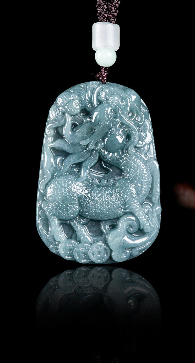 This Natural Grade A Jadeite Pendant is intricately carved with the image of a Qilin, a legendary creature symbolizing blessings, prosperity, and protection. Crafted from blue-water ice-type jadeite, the pendant showcases a fine translucency and smooth polish, making it both a meaningful talisman and a statement of refined style. Material: 100% natural Grade A jadeite (no dye, no chemical treatment)